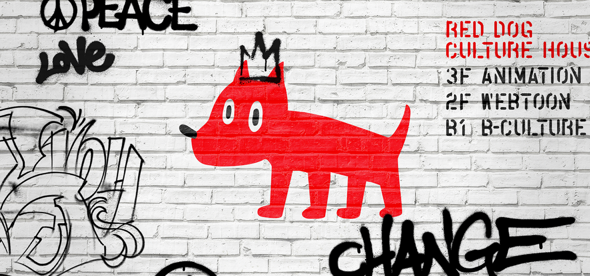 The words 'Red dog', 'Culture', 'House' were the keywords which we utilized to develop the brand concept and image. Red Dog is an effective symbol to represent the brand as an intuitive and strong motif. For Culture (subculture)' which represents the brand concept and core values, we played with an unconstrained expression of character, not a formulaic shape, to express the image of subculture. House represents the collection of stories that gather all these remarkable artists together, and is the place where each artist can bring their own ideas and drawings to life.